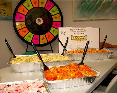 The Simon's employee prize wheel is seen behind a fabulous lunch delivered from neighboring Utica Pizza Company in North Syracuse. Management sent out this note first thing in the morning: "Lunch is on Simon's today... so enjoy and finish up the month strong :)" |